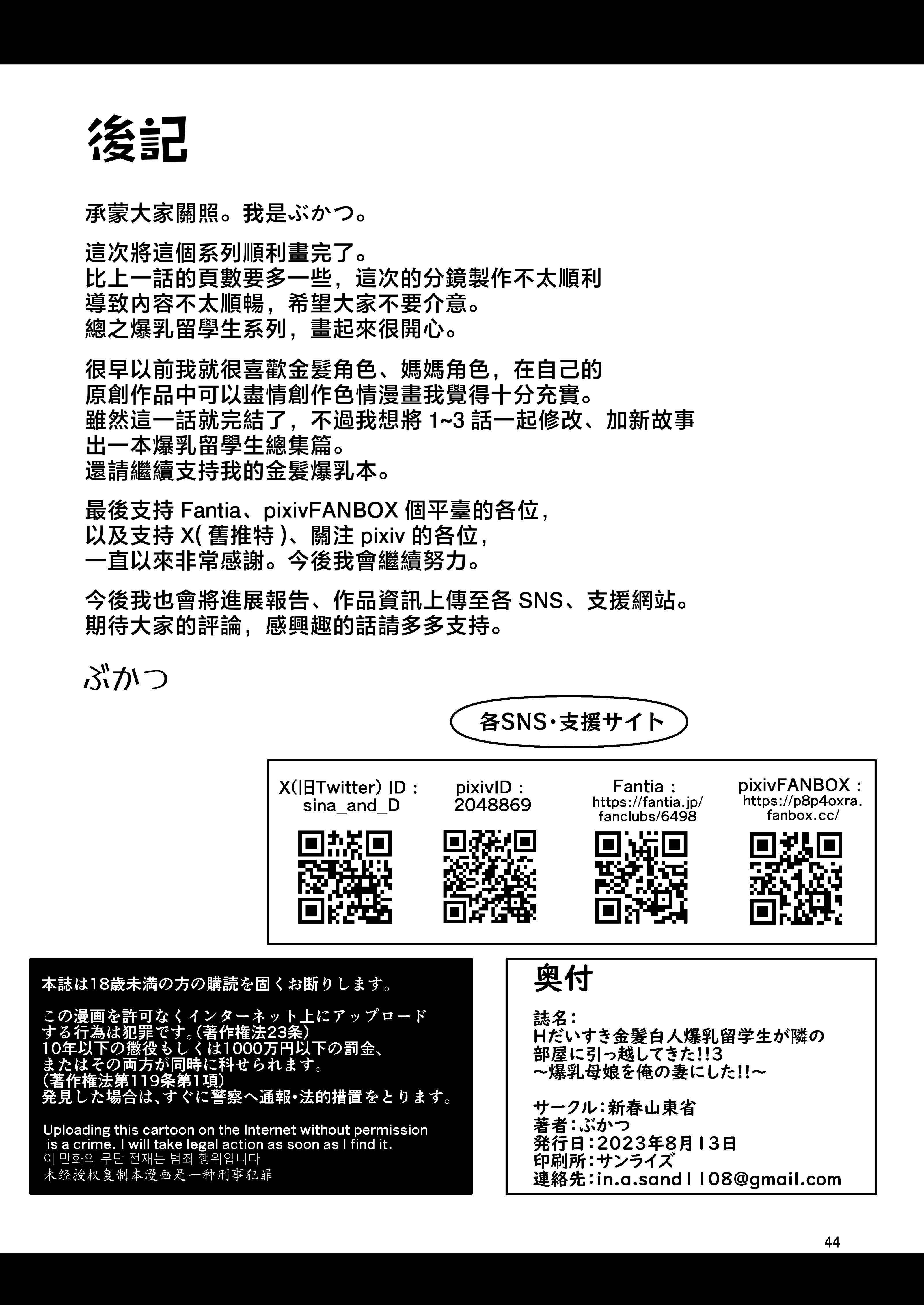 首頁>同人誌>漢化>[新春山東省 (ぶかつ)] Hだいすき金髪白人爆乳留学生が隣の部屋に引っ越してきた!!3〜爆乳母娘を俺の妻にした!!〜| 最喜欢H金发白种人爆乳留学生搬到了隔壁屋!!3 ~妈妈也成为了我的性伴侣~ [中国翻訳]>2023_natukomi_044