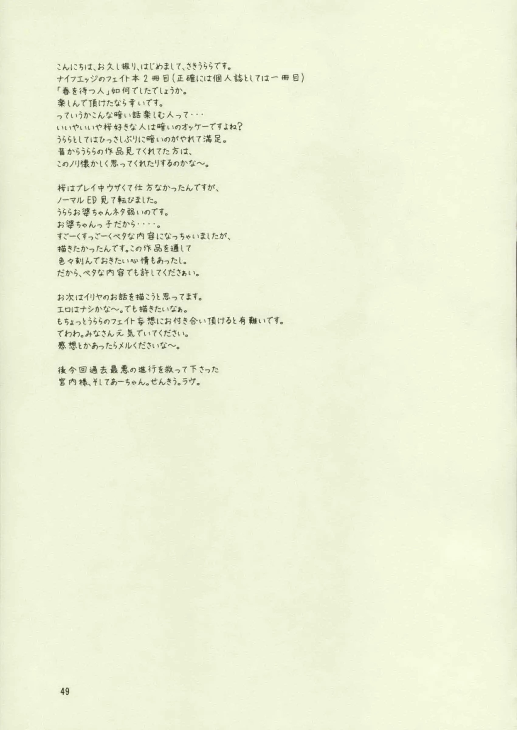 首頁>同人誌>漢化>[lzmcsa個人漢化] (月読宴) [ナイフエッジ (さきうらら)] 春を待つ人 | 等春的人 (Fate/stay night)>img048